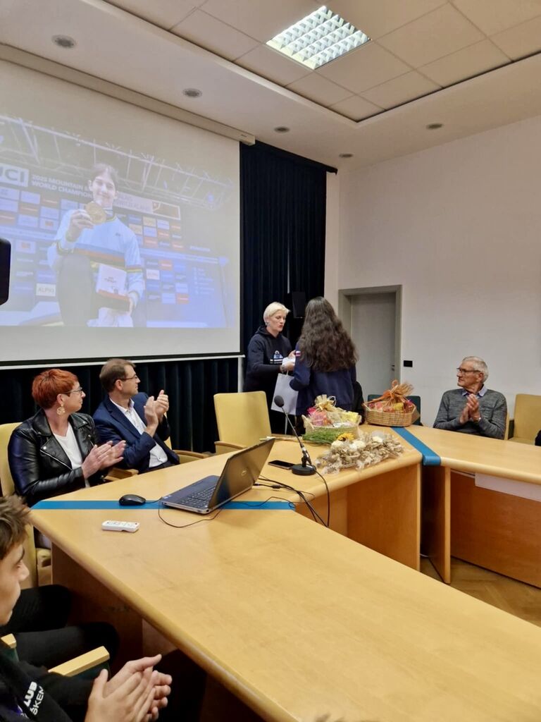 Na svečanosti je predsednica Kolesarskega kluba Ravne, Karin Sirovina Dvornik, Nežki podelila posebno personalizirano mavrično majico, simbol njenega svetovnega uspeha in truda, ki ga je vložila v dosego naslova svetovne mladinske prvakinje.