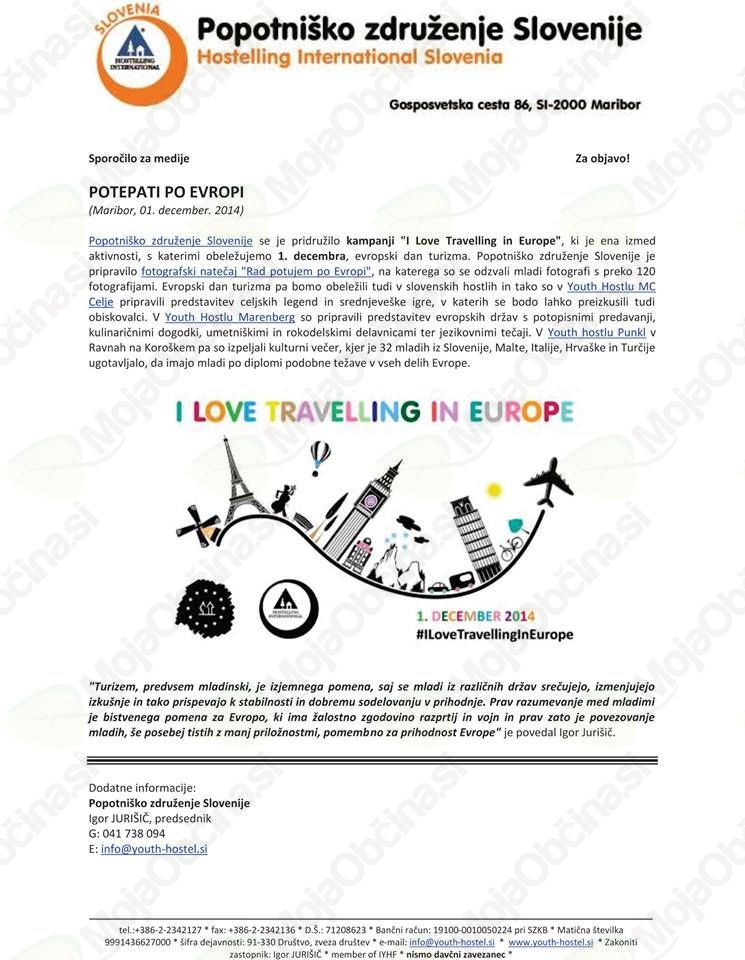 Popotniško združenje Slovenije se je pridružilo kampanji "I Love Travelling in Europe", ki je ena izmed aktivnosti, s katerimi obeležujemo 1. decembra, evropski dan turizma. Popotniško združenje Slovenije je pripravilo fotografski natečaj "Rad potujem po Evropi", na katerega so se odzvali mladi fotografi s preko 120 fotografijami. Evropski dan turizma pa bomo obeležili tudi v slovenskih hostlih in tako so v Youth Hostlu MC Celje pripravili predstavitev celjskih legend in srednjeveške igre, v katerih se bodo lahko preizkusili tudi obiskovalci. V Youth Hostlu Marenberg so pripravili predstavitev evropskih držav s potopisnimi predavanji, kulinaričnimi dogodki, umetniškimi in rokodelskimi delavnicami ter jezikovnimi tečaji. V Youth hostlu Punkl v Ravnah na Koroškem pa so izpeljali kulturni večer, kjer je 32 mladih iz Slovenije, Malte, Italije, Hrvaške in Turčije ugotavljalo, da imajo mladi po diplomi podobne težave v vseh delih Evrope.