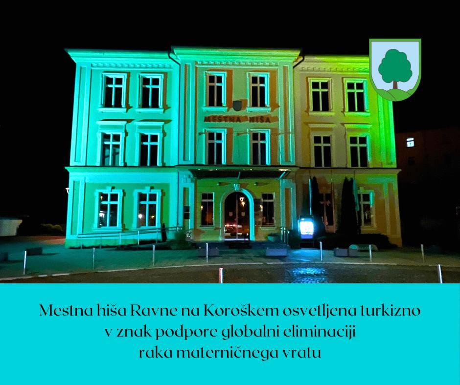 V znak podpore prizadevanjem za zdravo lokalno skupnost, v duhu globalne eliminacije raka materničnega vratu, smo se na Ravnah v preteklem tednu, na pobudo NIJZ OE Ravne in predstojnice dr. Nede Hudopisk, dr.med., spec. javnega zdravja, pridružili pobudi s turkizno osvetlitvijo Mestne hiše.