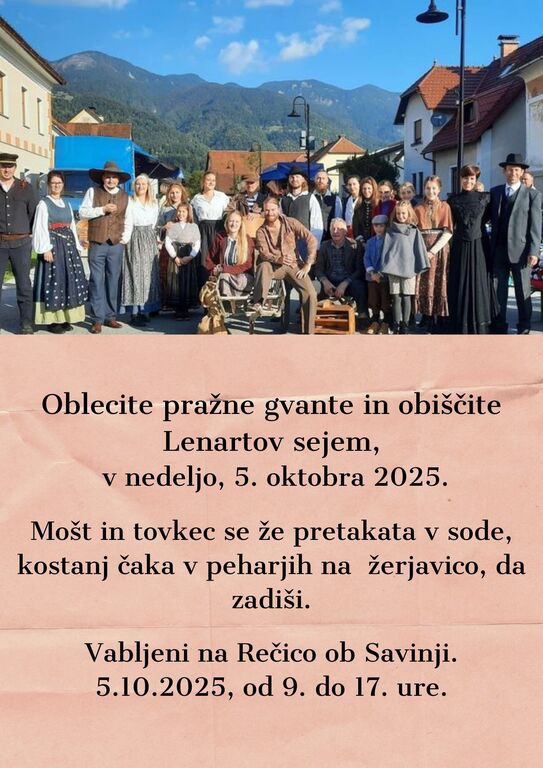 Turistično društvo Rečica ob Savinji obvešča, da Lenartov sejem, napovedan za nedeljo, 5. 10. 2025, zaradi slabega vremena odpade.