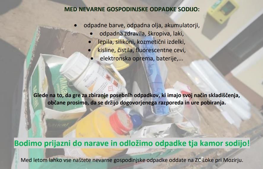 Javno podjetje Komunala Mozirje obvešča občanke in občane Občine Rečica ob Savinji, da v soboto, 19. 10. 2024, organizira ZBIRANJE NEVARNIH ODPADKOV IZ GOSPODINJSTEV.