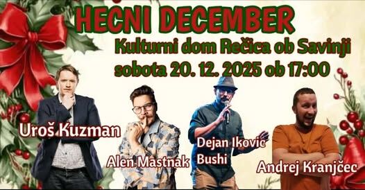 - V soboto, 20. decembra, ob 17. uri Kulturno društvo vabi na stand up večer Hecni december z Urošem Kuzmanom, Dejanom (Buši) Ikovicem, Alenom Mastnakom in Andrejem Kranjčecem.