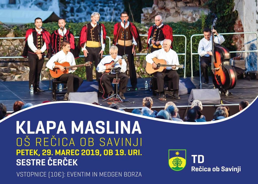 Tokrat bo z nami Klapa Maslina, ki se bo v telovadnici Osnovne šole Rečica ob Savinji predstavila v petek, 29. marca, ob 19. uri. na koncertu bodo zapele tudi sestre Čerček. Vstopnice so na voljo na Eventimu in v Medgen borzi.
