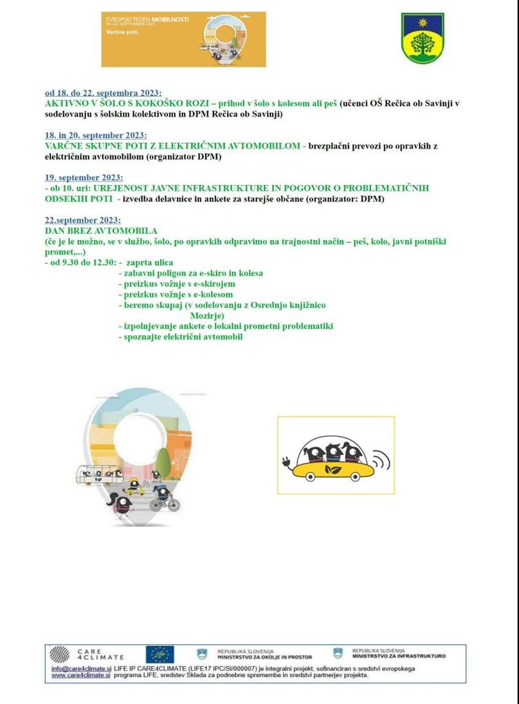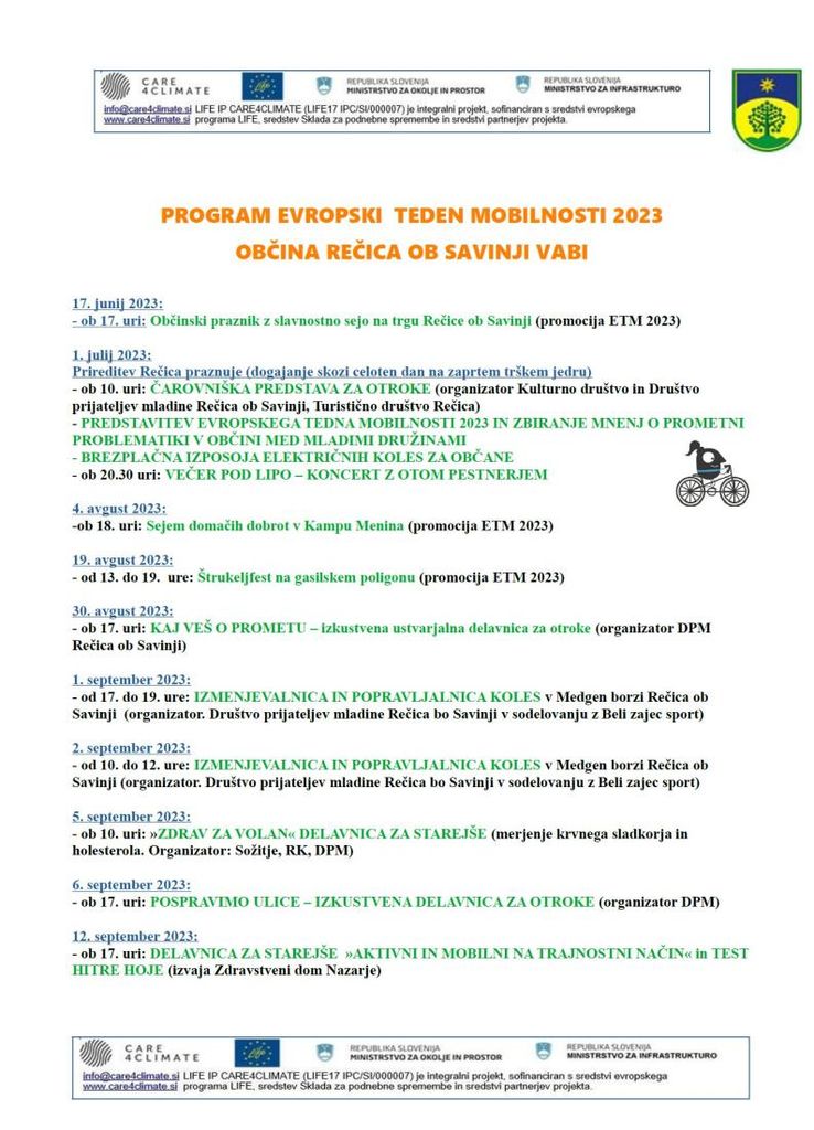 Ker pa se v Občini Rečica ob Savinji zavedamo, da je premalo, če k sloganu POTUJ TRAJNOSTNO IN VARČNO, spodbujamo samo en teden v letu, smo pripravili pester nabor aktivnosti skozi poletje in jesen 2023.
