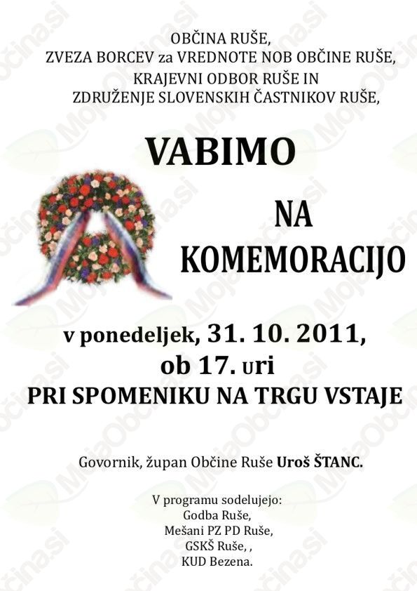 Združenje borcev in udeležencev NOB Občine Ruše Vas vljudno vabi na komemoracijo, ki bo v ponedeljek, 31. oktobra 2011, s pričetkom bo 17.00 uri pri spomeniku NOB na Trgu vstaje v Rušah.