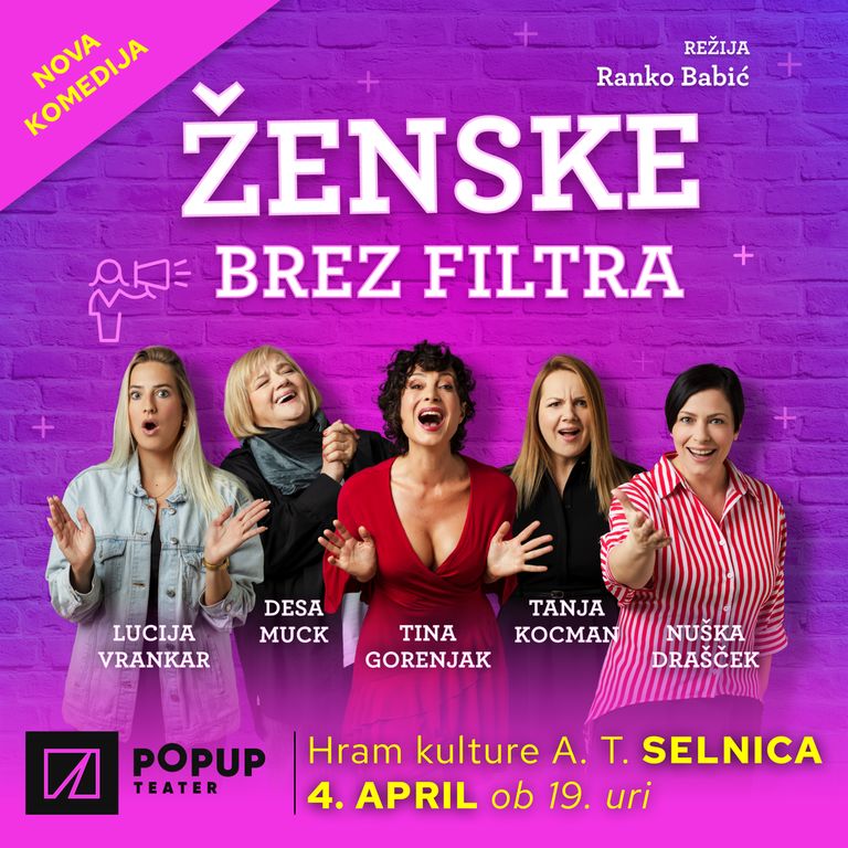 Vsaka od teh 5 žensk prinaša svojo zgodbo in izkušnje, vse pa združuje nefiltriran pogled na današnji svet, ki je pogosto prekrit s filtri. Na odru vas bo teh 5 žensk s vpogledom v svoje življenje in razmišljanje zagotovo nasmejalo do solz, filtre pa bodo prihranile za Instagram.