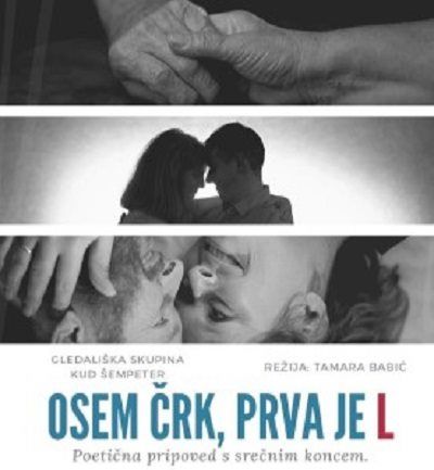 Predstava »Osem črk, prva je L« je zabavna poetična pripoved s srečnim koncem, ki pripoveduje o ljubezni med Njim in Njo ter vzponih in padcih v njuni zvezi. Pred gledalčevimi očmi se v slogu filmskega gledališča nizajo prizori iz njunega življenja.