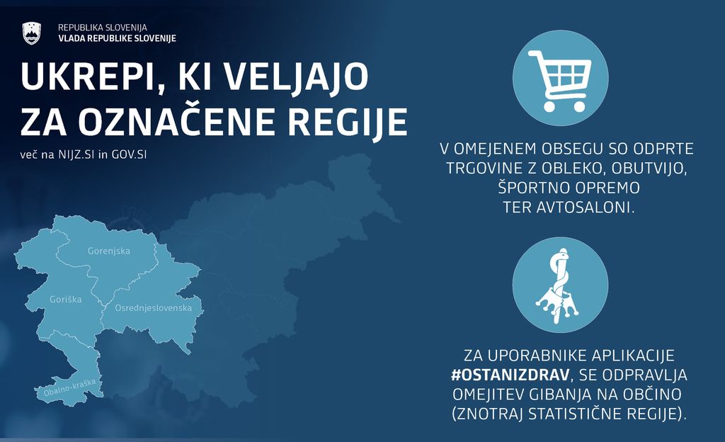 Po podatkih NIJZ o številu okužb glede na 14-dnevno incidenco na 100.000 prebivalcev po posamezni statistični regiji Slovenije v obdobju med 27. 11. in 10. 12. 2020 so epidemiološko najbolj ugodne statistične štiri regije - Gorenjska, Obalnokraška, Osrednjeslovenska in Goriška. Za prebivalce teh štirih regijah se delno sprosti omejitev gibanja med občinami. Gibanje je tako omejeno na območje celotne regije, kjer imajo osebe prebivališča in ne več na posamezno občino. Pogoj je, da ima oseba na mobilnem telefonu naloženo in stalno aktivirano mobilno aplikacijo #OstaniZdrav. Izjema velja tudi za športno-rekreativne dejavnosti.