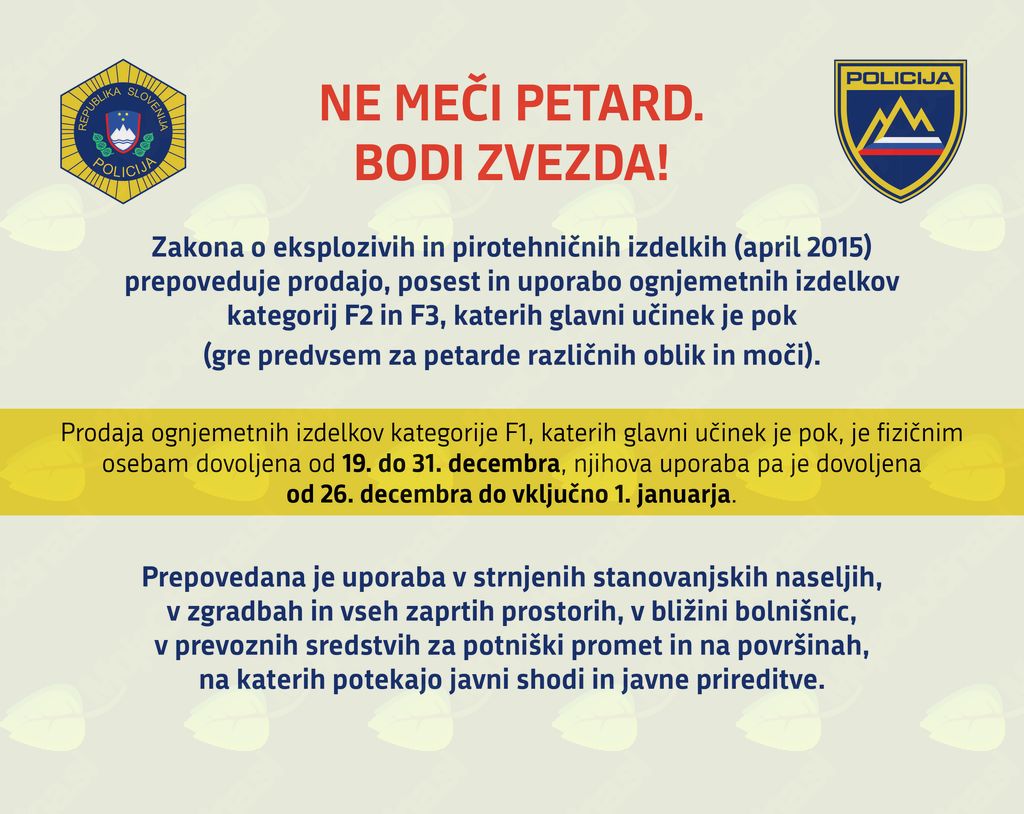 Leto je naokoli in zopet je tu mesec december. Mesec veselja, rajanja, žal pa je za nekatere tudi mesec  žalosti. Žalosti, ki jih povzročijo pirotehnični izdelki. Policisti vsako leto poskušajo storiti, kar je v njihovi moči, da omejijo in zmanjšajo možnost poškodb zaradi pirotehničnih izdelkov in petard, vendar se le-ta sredstva vsako leto znova množično uporabljajo.