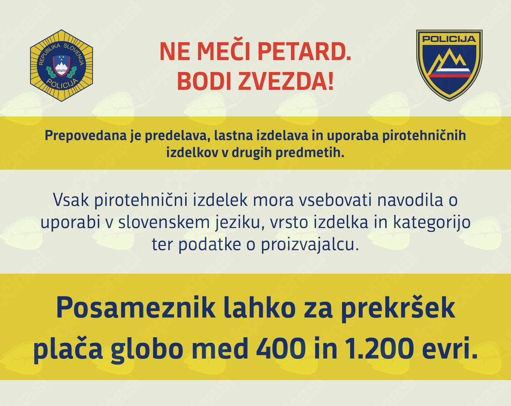 Policisti bodo dosledno ukrepali proti vsem, ki bodo kršili določbe o uporabi pirotehničnih izdelkov. Za navedene kršitve posameznika je predvidena globa od 400 do 1.200 evrov.