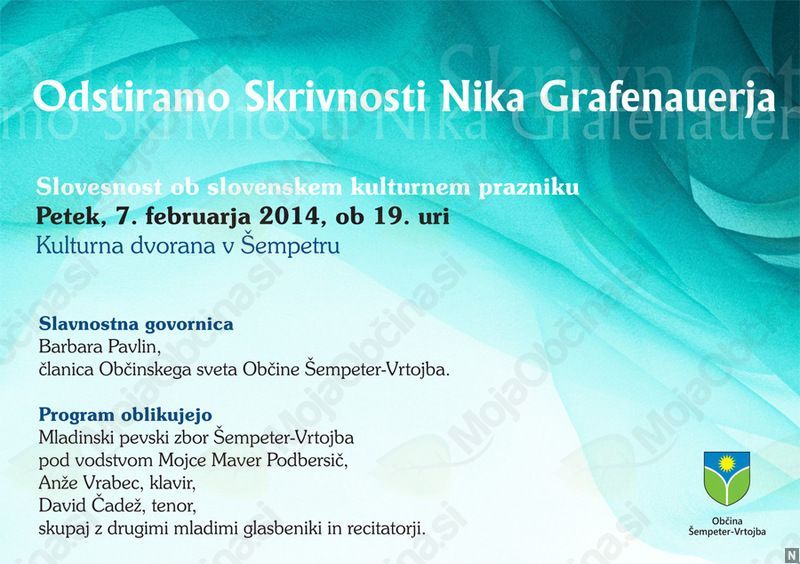 V petek, 7. februarja, je Občina Šempeter-Vrtojba v sodelovanju z Mladinskim pevskim zborom Šempeter-Vrtojba priredila osrednjo slovesnost ob praznovanju slovenskega kulturnega praznika. Rdeča nit večera je bila pesniška zbirka Nika Grafenauerja, ki se s svojimi dosežki in literarnim opusom uvršča med najpomembnejše literarne ustvarjalce slovenske književnosti. Njegovo kultno pesniško zbirko Skrivnosti iz leta 1983, sicer nekateri uvrščajo med poezijo za otroke, vendar obenem prav ta najbolj prepričljivo razgrnila spiralo metamorfoz njegovih poetik. Z njo se Grafenauer razkriva kot pesnik razkošne, preproste in emotivno nabite poezije. Nastopajoči so njegove skrivnosti barvito in harmonično razkrivali s pesmijo, plesom in brano besedo.