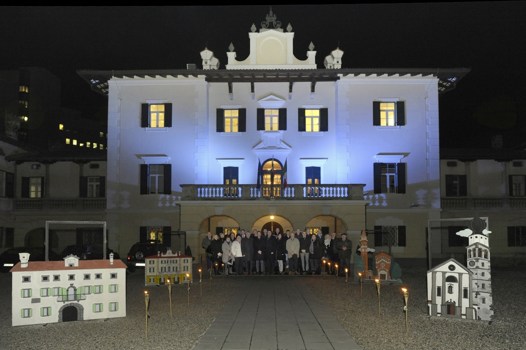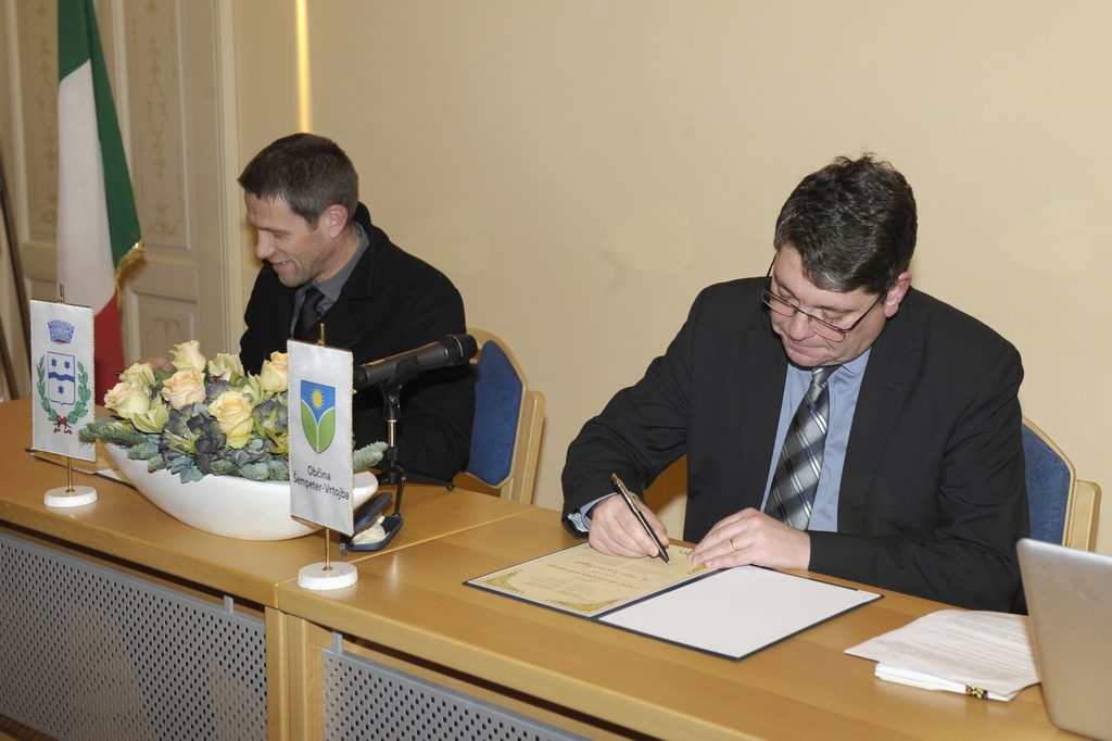 in Davide Furlan v Coroninijevem dvorcu v prepričanju, da izpolnjujeta pričakovanja naših občank in občanov, z željo poglobiti dolgoletne vezi, s podpisom listine obnovila pobratenje, ki med krajema Šempeter pri Gorici in Romans d'Isonzo traja že dolgih 30, med občinama pa 10 let.