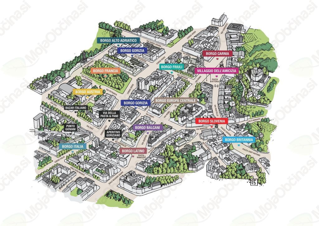 Okusi ob meji se razprostirajo na več kot 2 km2, glavno prizorišče na Piazza Vittoria (Travnik), kjer se bo nahajala »Vas prijateljstva«. Tukaj bo mogoče okušati ponovno snidenje stare goriške grofije – tradicionalne okuse Posočja, goriško gradiščanskega območja, slovenskih in italijanskih Brd. Tam bo tudi stojnica, kjer se bodo predstavljali ponudniki iz Občine Šempeter-Vrtojba.