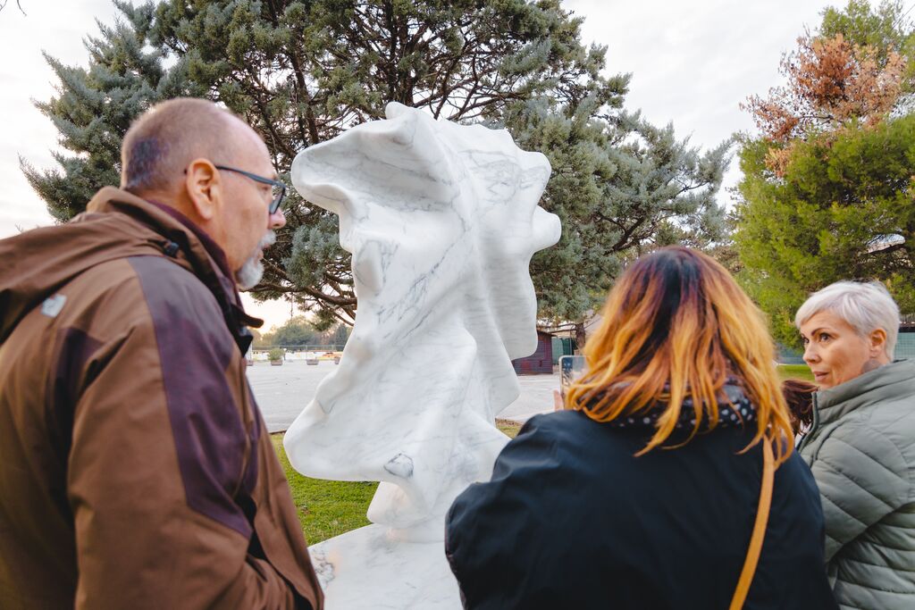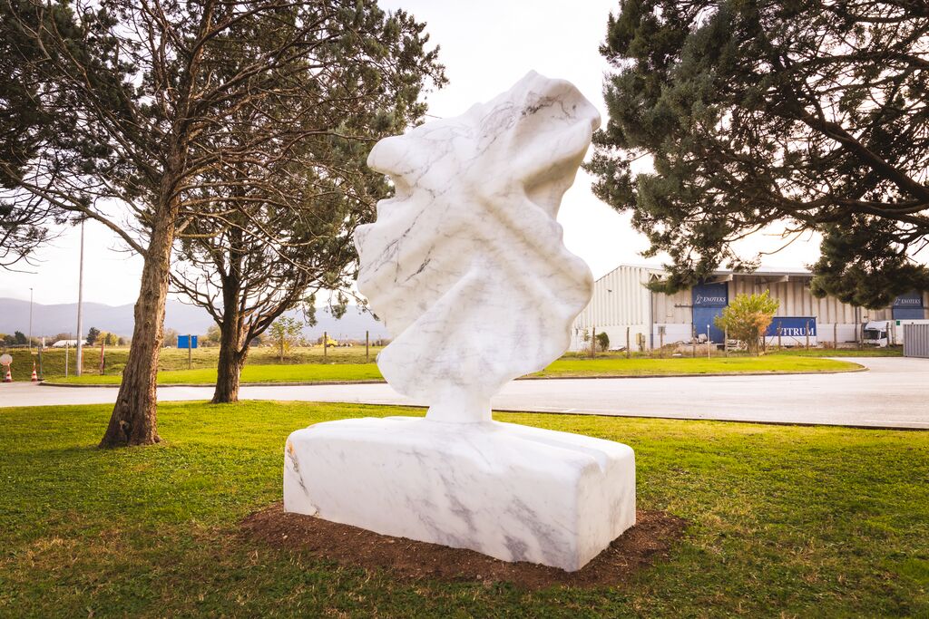 Skulptura italijanske kiparke Beatrice Taponecco, ki se je predstavila že na številnih samostojnih in skupinskih razstavah v Italiji ter uresničila več javnih kiparskih projektov, je rezultat zmage na mednarodnem natečaju, ki ga je v okviru projekta CREW objavil projektni partner Kulturni dom Nova Gorica. "Njena silhueta z moduliranim, ritmičnim gibanjem presega mejo med umetnino in prostorom. Linije se iz središča razpirajo v mehkih prehodih, brez ostrih robov – kot vizualna metafora odprtosti in dialoga. Bela površina kararskega marmorja, ki v svetlobi postane skoraj prosojna, vzbuja občutek prepustnosti in zračne lahkotnosti. Oblikovna zasnova, navdihnjena z rastlinskimi strukturami – predvsem z obliko lista – združuje organsko rast z uravnoteženo kompozicijo. Skulptura se odziva na svetlobo in gibanje opazovalca ter postaja dinamičen element prostora. Simbolizira harmonijo, povezanost in sožitje med naravo, človekom in kulturo", je ob predstavitvi povedala Pavla Jarc iz Kulturnega doma Nova Gorica. Vodja Mestne galerije Nova Gorica je še poudarila, da se v Kulturnem domu Nova Gorica zavedajo, da skulptura stoji v okolju, ki je zaradi različnih družbeno-ekonomskih sprememb nekoliko izgubilo svoj sijaj. Prav zato se jim je zdelo pomembno, da skulpturo postavijo prav tja – ker umetnost odpira prostor dialoga, ga plemeniti in daje ljudem razlog, da ga znova opazijo, začnejo redefinirati in ceniti. S tem kipom želijo sprožiti proces preobrazbe – da umetniška intervencija deluje kot pobuda za izboljšanje, povezovanje in vračanje vrednosti prostoru.