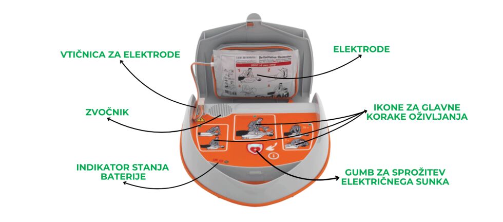 AED je naprava, ki v primeru srčnega zastoja s pomočjo električnega sunka poskuša srce spraviti nazaj v usklajeno delovanje.