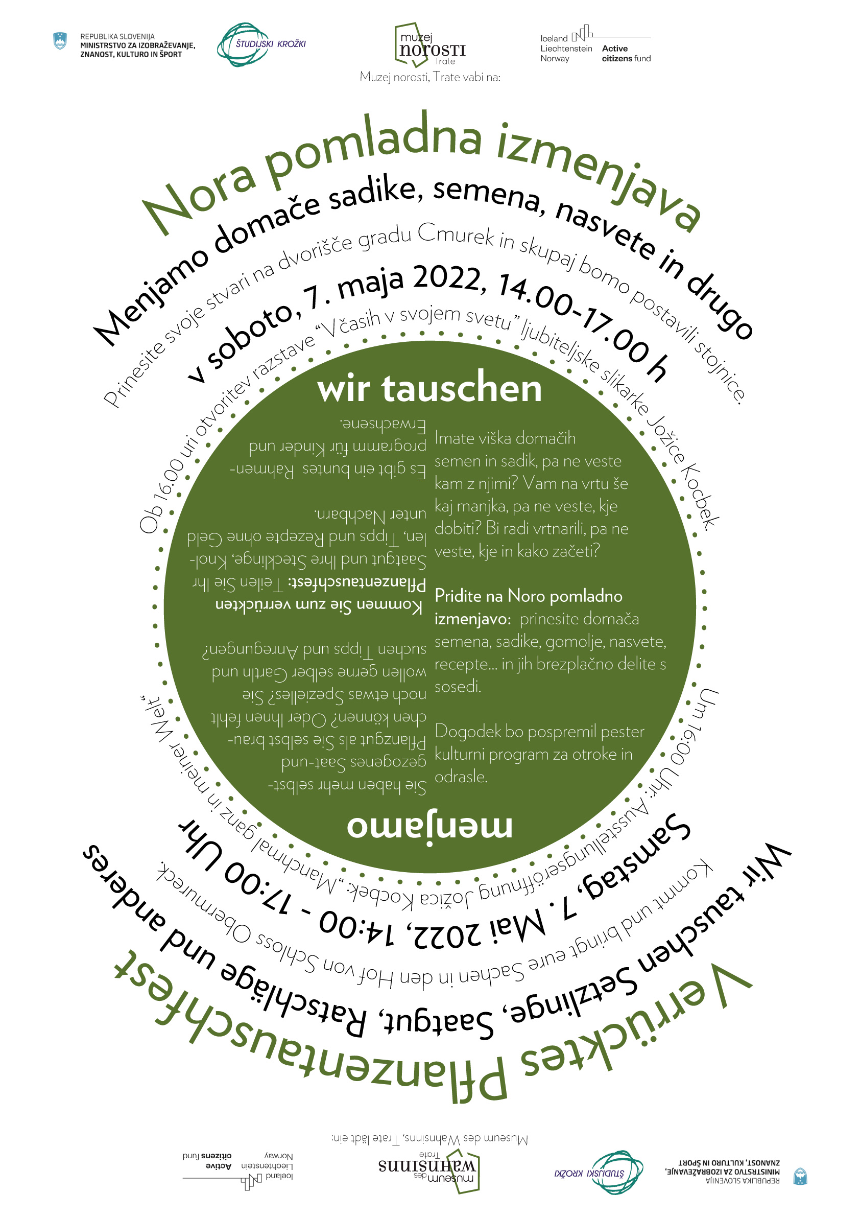 Potem si že danes pribeležite na koledarju, da se srečamo v soboto, 7. maja 2022, ob 14. uri na dvorišču gradu Cmurek, kjer bomo med seboj brezplačno izmenjali semena, sadike, nasvete in še kaj.