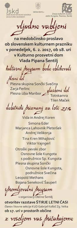 Vabimo vas na medobčinsko proslavo ob kulturnem prazniku, ki bo v ponedeljek, 6. februarja, ob 18. uri, v Kulturno prosvetnem domu Vlada Pipana v Šentilju.