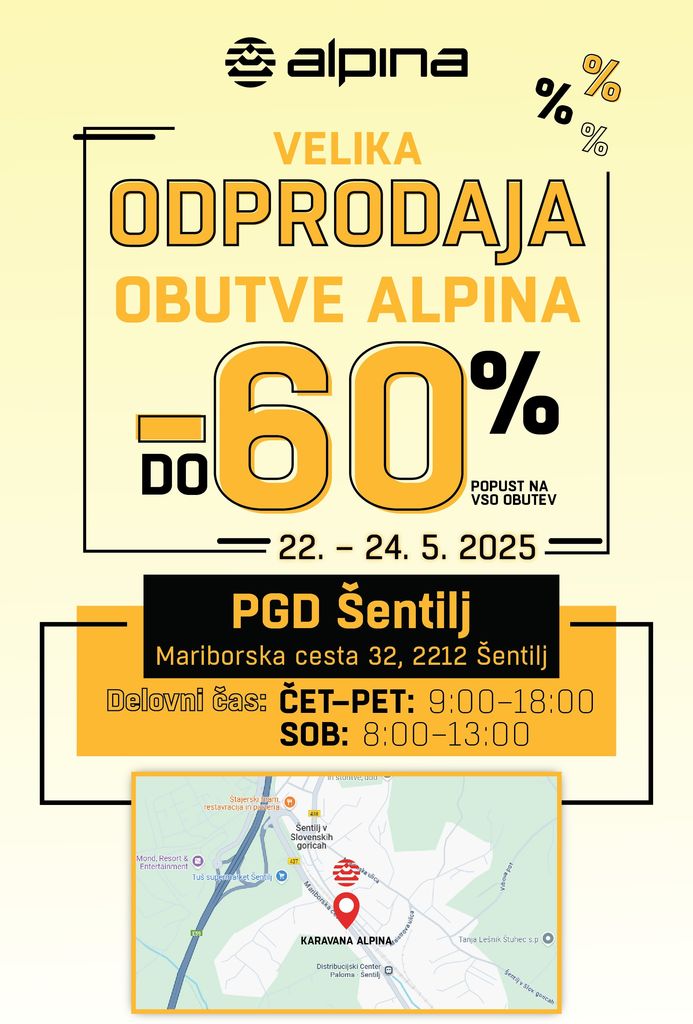 V gasilskem domu Šentilj bo od četrtka, 22. maja do sobote, 24. maja 2025, potekala velika odprodaja Alpinine obutve po znižanih cenah – popusti segajo vse do 60%!