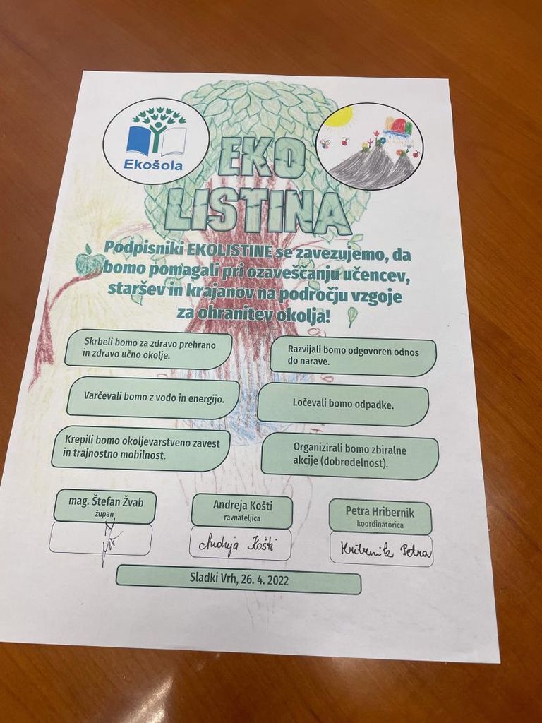 S podpisom so se tako v imenu učencev šole, delavcev šole, staršev ter lokalne skupnosti zavezali, da se bodo s skupnimi močmi zavzemali za dvigovanje ekološke zavesti ter skrbeli za naravo in nam prijazen razvoj kraja.