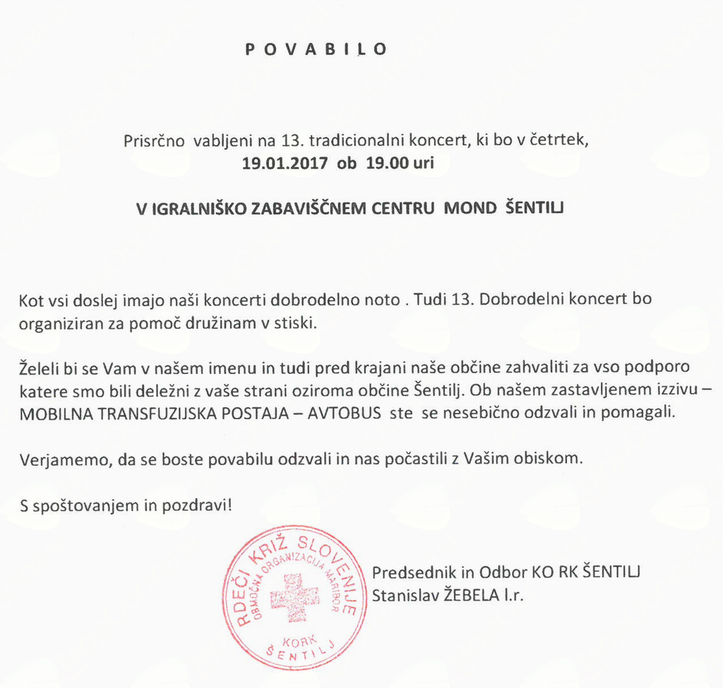 Vabljeni na že 13. TRADICIONALNI KONCERT KRAJEVNE ORGANIZACIJE RDEČEGA KRIŽA ŠENTILJ, ki bo v četrtek, 19. januarja ob 19. uri v IGRALNIŠKO ZABAVIŠČNEM CENTRU MOND ŠENTILJ.