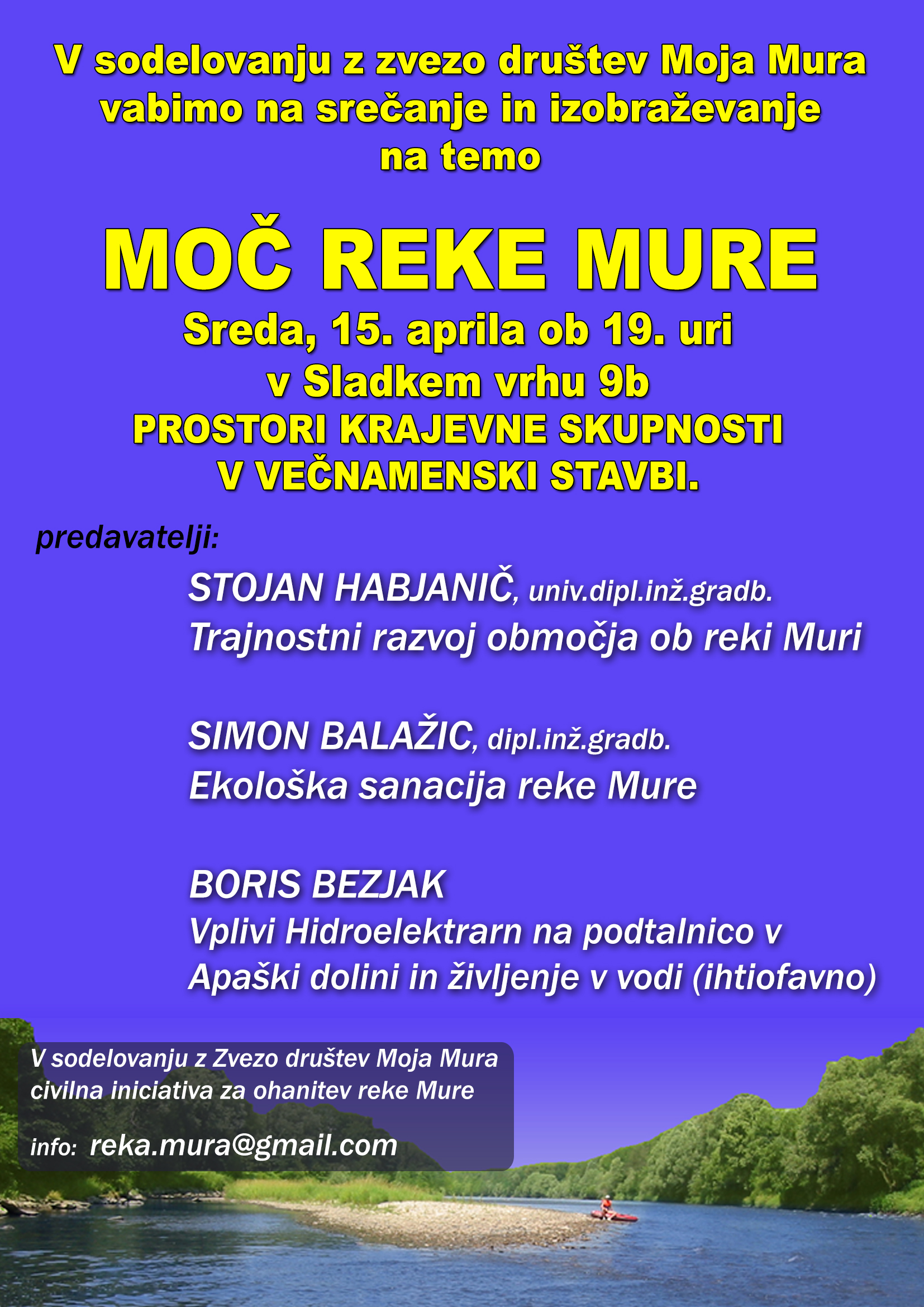 Da bi se še bolje seznanili s tem našim naravnim bogastvom, vas vabimo, da se udeležite srečanja in izobraževanja na temo Moč reke Mure, ki bo potekalo v sredo, 15. aprila 2015, ob 19. uri, v prostorih Krajevne skupnosti Sladki Vrh.