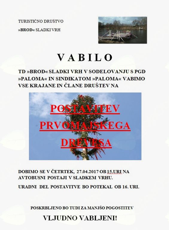 TD »Brod« Sladki Vrh v sodelovanju s PGD »Paloma« in Sindikatom »Paloma« vabi vse krajane in člane društev na postavitev majskega drevesa.