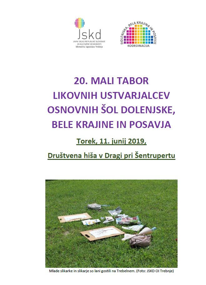 Vabljeni na 20. MALI TABOR LIKOVNIH USTVARJALCEV OSNOVNIH ŠOL DOLENJSKE, BELE KRAJINE IN POSAVJA, ki bo v torek, 11. junija 2019, v Društveni hiši v Dragi pri Šentrupertu.