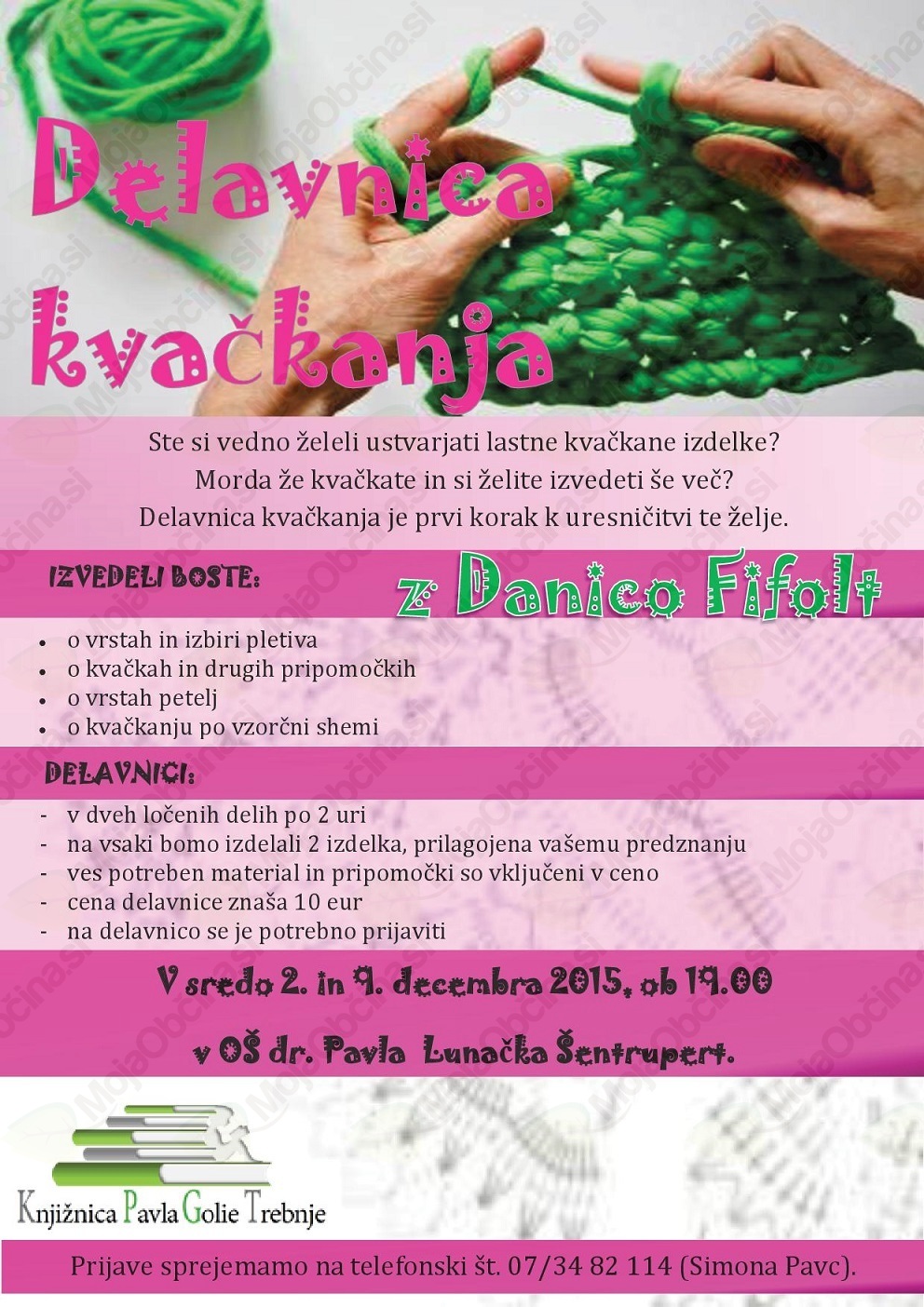 Vabljeni na delavnico kvačkanja z Danico Fifolt v sredo, 2. in 9. decembra 2015, ob 19.00 v OŠ dr. Pavla Lunačka Šentrupert.