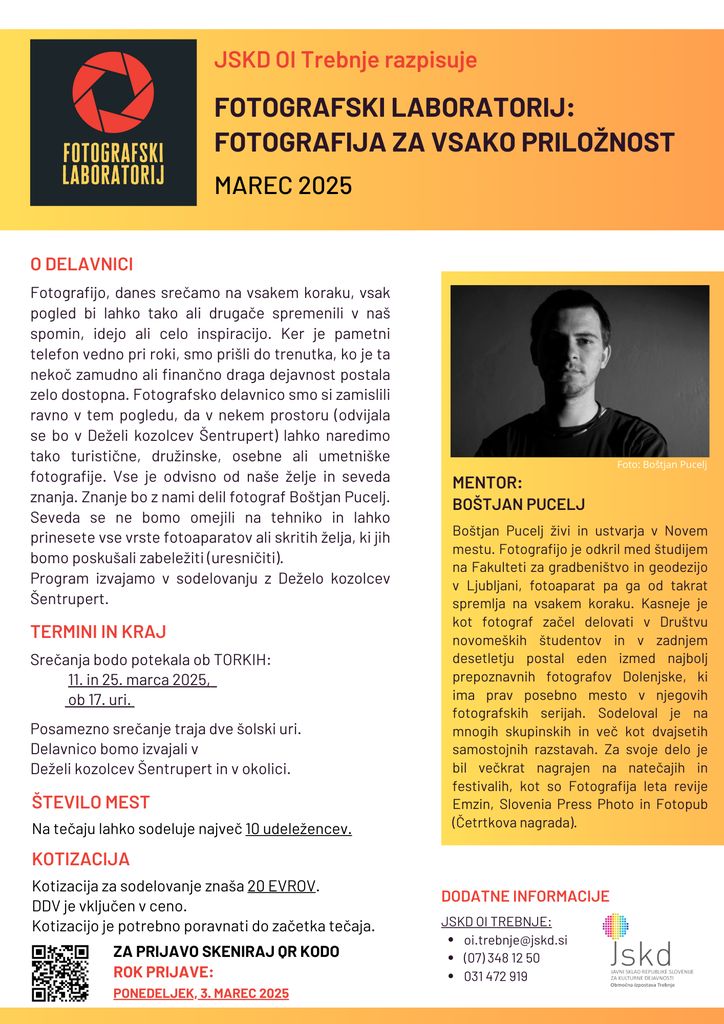 Fotografijo, danes srečamo na vsakem koraku, vsak pogled bi lahko tako ali drugače spremenili v naš spomin, idejo ali celo inspiracijo. Ker je pametni telefon vedno pri roki, smo prišli do trenutka, ko je ta nekoč zamudno ali finančno draga dejavnost postala zelo dostopna. Fotografsko delavnico smo si zamislili ravno v tem pogledu, da v nekem prostoru (odvijala se bo v Deželi kozolcev Šentrupert) lahko naredimo tako turistične, družinske, osebne ali umetniške fotografije. Vse je odvisno od naše želje in seveda znanja. Znanje bo z nami delil fotograf Boštjan Pucelj. Seveda se ne bomo omejili na tehniko in lahko prinesete vse vrste fotoaparatov ali skritih želja, ki jih bomo poskušali zabeležiti (uresničiti).