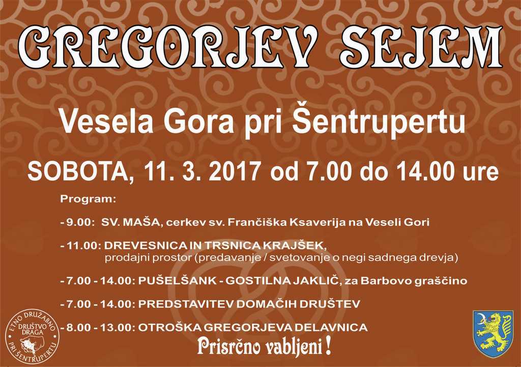 Gregorjeva sobota bo tudi letos v znamenju Gregorjevega sejma na Veseli Gori pri Šentrupertu, ki bo letošnje leto v soboto 11. 3. 2017. Sejem z več kot 200 letno tradicijo bo tudi tokrat veselo zaživel in bo imel kaj ponuditi – več kot 50 razstavljavcev se bo predstavilo in ponujalo svoje izdelke. Predstavljajo se trsničarji, krošnjarji, suha roba, prodajalci semen, mesnin pa tudi obrtniki in podjetniki. Sejem bo spremljal tudi pester program in sicer bo ob 9. uri ponovno v veselogorski cerkvi Sv. Frančiška Ksaverija sejemska Sv. maša, kar izvira iz same tradicije omenjenega sejma. Predstavila se bodo domača društva, za najmlajše bomo imeli Otroško Gregorjevo delavnico, na kateri bodo otroci izdelovali EKO gregorčke, ob 11.00 uri pa bo sledil sedaj že tradicionalen prikaz obrezovanja – nege sadnega drevja. Sejem bo popestren tudi z zabavnim programom harmonikarjev, manjkala pa ne bo niti gostinska ponudba.