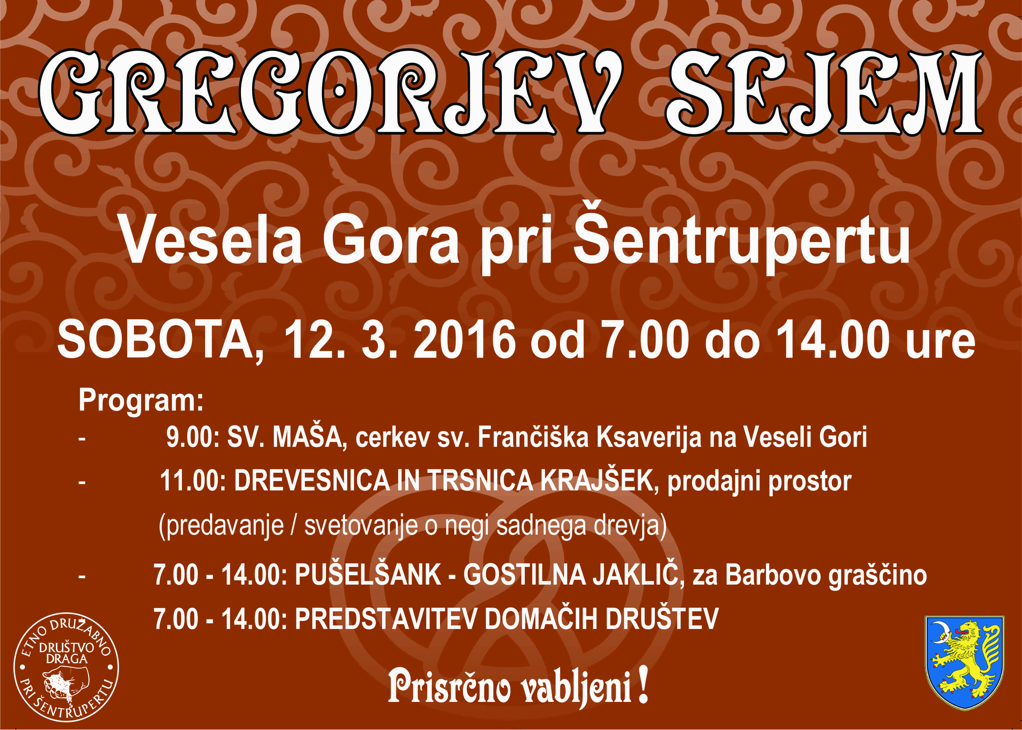 Gregorjeva sobota bo tudi letos v znamenju Gregorjevega sejma na Veseli Gori pri Šentrupertu, ki bo letošnje leto prav na Sv. Gregorja. Sejem z več kot 200 letno tradicijo bo tudi tokrat veselo zaživel in bo imel kaj ponuditi – več kot 50 razstavljavcev se bo predstavilo in ponujalo svoje izdelke. Predstavljajo se trsničarji, krošnjarji, suha roba, semena, mesnine, pa tudi obrtniki in podjetniki. Sejem bo spremljal tudi pester program in sicer bo ob 9. uri ponovno v veselogorski cerkvi Sv. Frančiška Ksaverija sv. maša, kar izvira iz same tradicije omenjenega sejma, saj so bila prav romanja povod, da se je skozi zgodovino na Veseli Gori razvilo sejemsko dogajanje, predstavila se bodo tudi domača društva, ob 11.00 uri pa bo sledilo predavanje in prikaz obrezovanja – nege sadnega drevja. Sejem bo popestren tudi z zabavnim programom, manjkala pa ne bo niti gostinska ponudba.