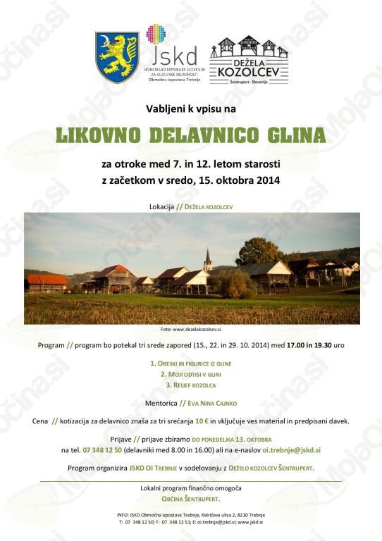 Vabljeni k vpisu na LIKOVNO DELAVNICO GLINA za otroke med 7. in 12. letom starosti s pričetkom v sredo, 15. oktobra 2014, v Deželi kozolcev Šentrupert.