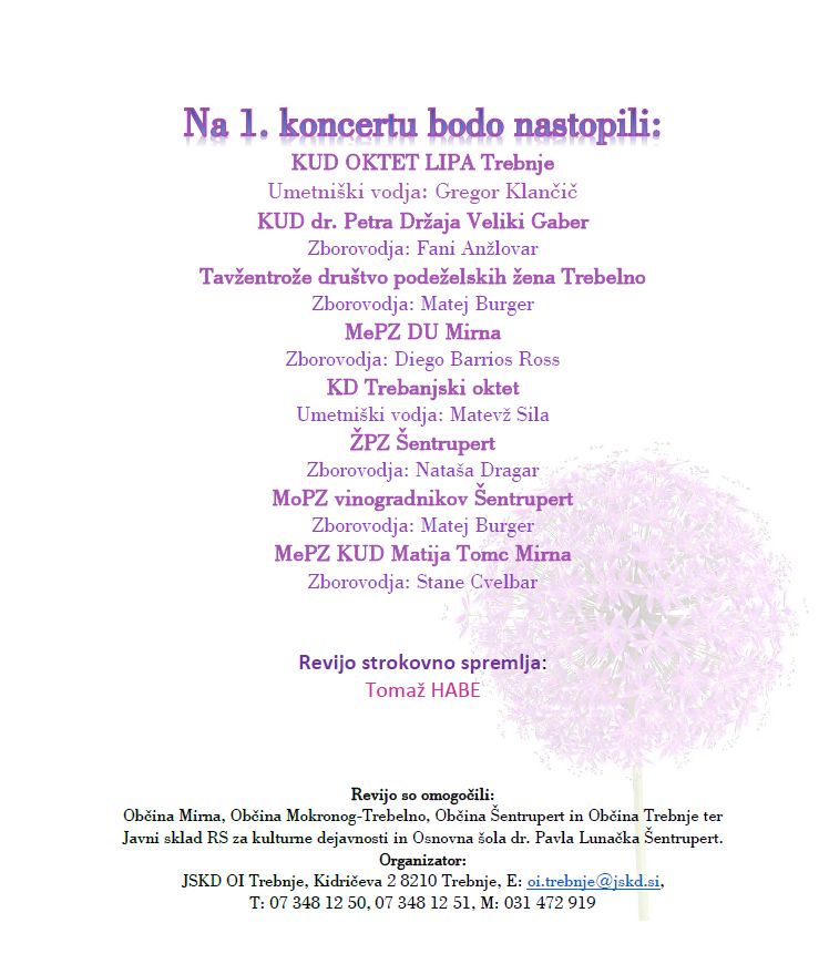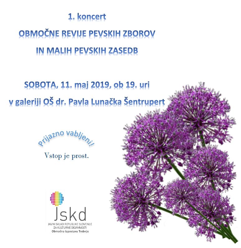 Vljudno vabljeni na 1. koncert območne revije pevskih zborov in malih pevskih zasedb. Revija bo v soboto, 11. maja 2019, ob 19. uri v galeriji OŠ dr. Pavla Lunačka Šentrupert.