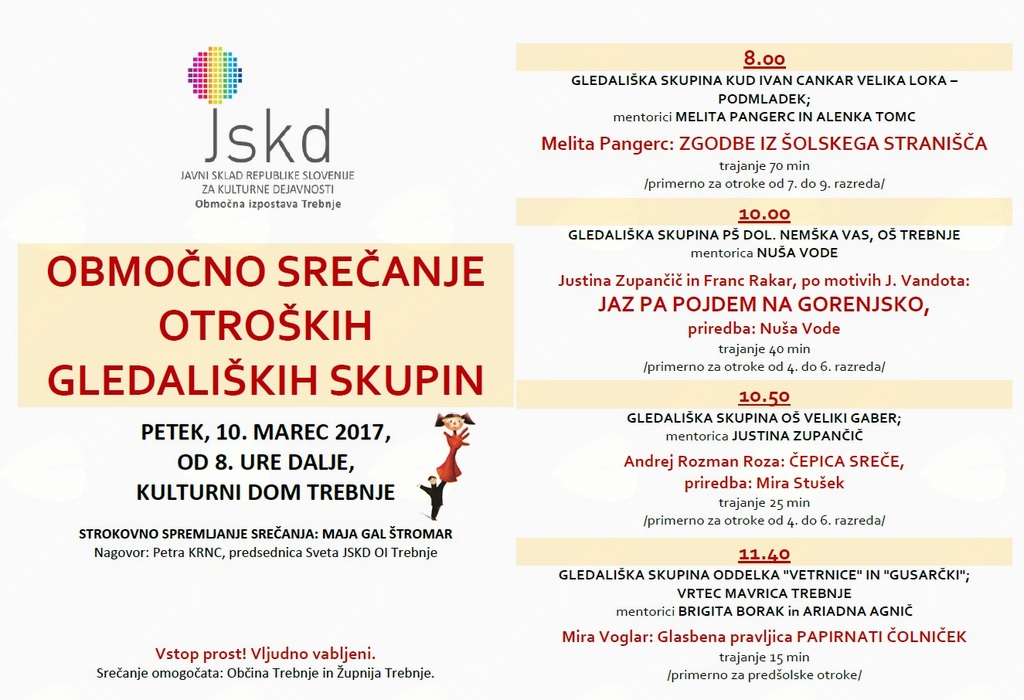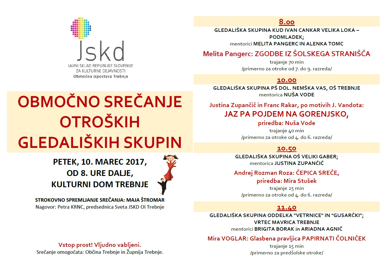 JSKD OI Trebnje vas vljudno vabi na Območno srečanje otroških gledaliških skupin, ki bo v petek, 10. marca 2017, v Kulturnem domu Trebnje, od 8. ure dalje. Vstop prost!