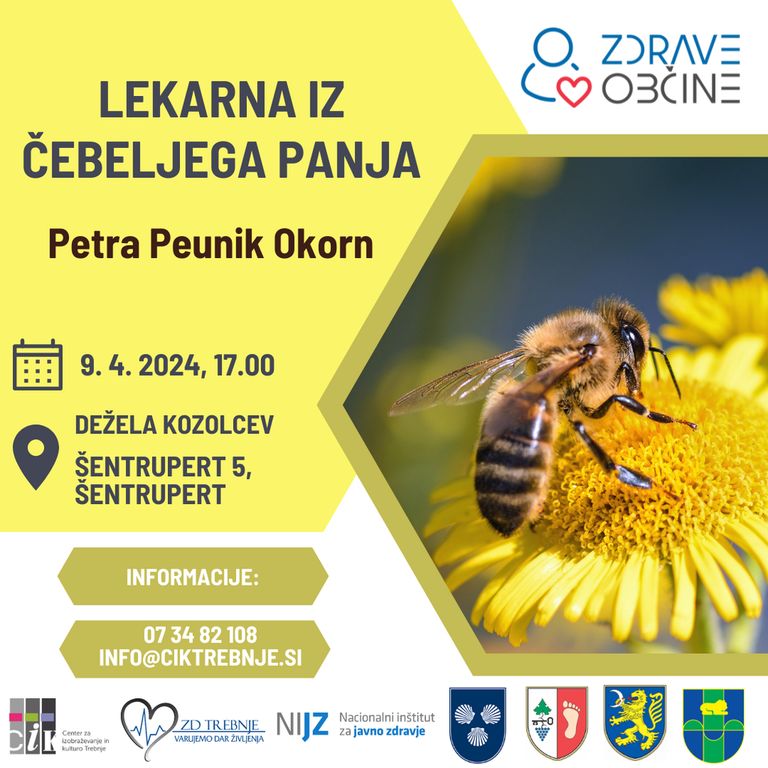 Na predavanju bomo spoznali nekaj zanimivosti iz življenja čebelje družine. Glavni poudarek bo na apiterapiji in šestih čebeljih pridelkih. Apiterapija je namreč veda, ki s pomočjo čebeljih pridelkov pomaga pri krepitvi in ohranjanju zdravja. Izvedeli bomo, kako varno posegati po čebeljih pridelkih tako, da bodo njihove učinkovine najbolje izkoristili v svojo prid. Ob koncu bomo lahko poskusili nekaj vrst medu in čebeljih pridelkov ter spoznali nekaj apiterapevtskih pripravkov. Z nami bo Petra Peunik Okorn.