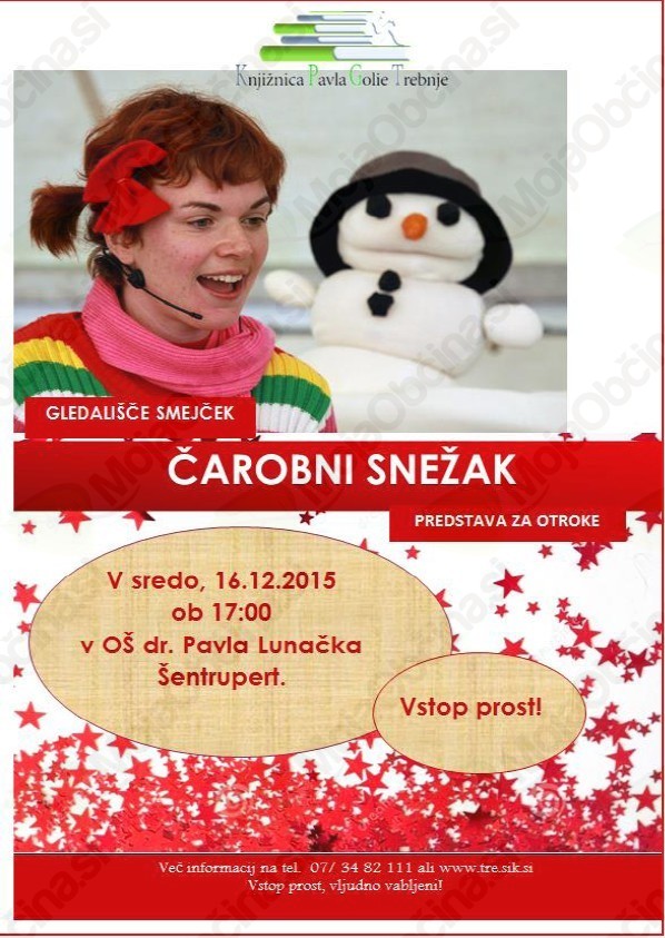 Vse otroke ter mlade po duši in srcu vabimo na predstavo Gledališča Smejček Čarobni snežak, ki bo v sredo, 16. 12. ob 17.00, v večnamenskem prostoru OŠ dr. Pavla Lunačka Šentrupert.
