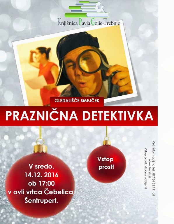 Vabljeni na predstavo za otroke Praznična detektivka, ki jo bo izvedlo Gledališče Smejček v sredo, 14. 12. 2016, ob 17. uri v avli vrtca Čebelica v Šentrupertu.