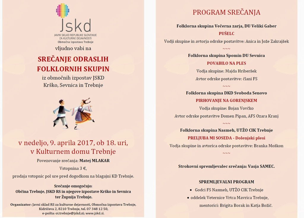 V nedeljo, 9. februarja 2017, vas ob 18. uri vabimo v Kulturni dom Trebnje na Območno srečanje odraslih folklornih skupin iz OI JSKD Krško, Sevnica in Trebnje.