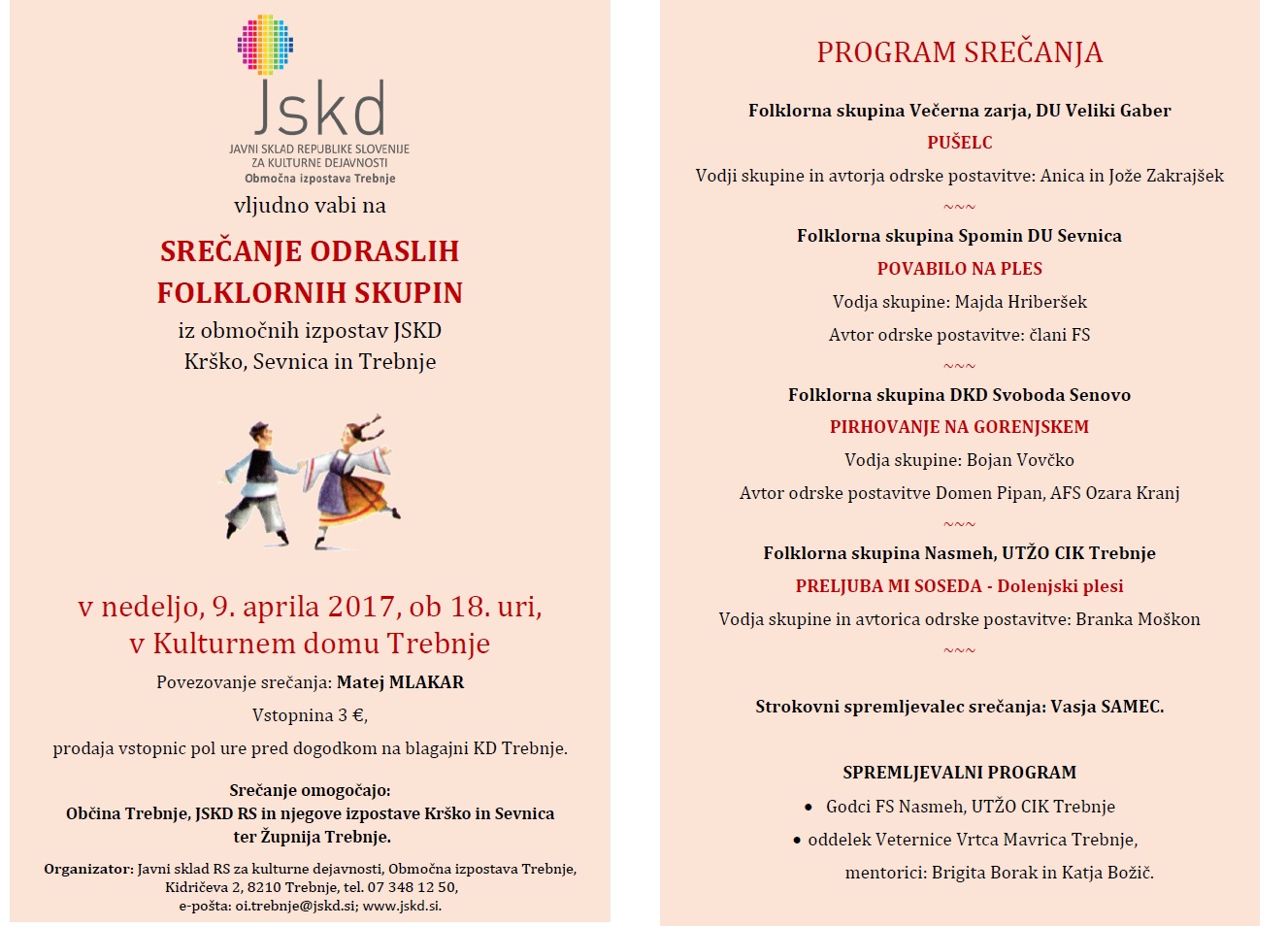 Srečanje bo strokovno spremljal Vasja Samec. Povezovanje srečanja Matej Mlakar.Vstopnice po 3 eur bodo na voljo pol ure pred dogodkom na blagajni KD Trebnje.