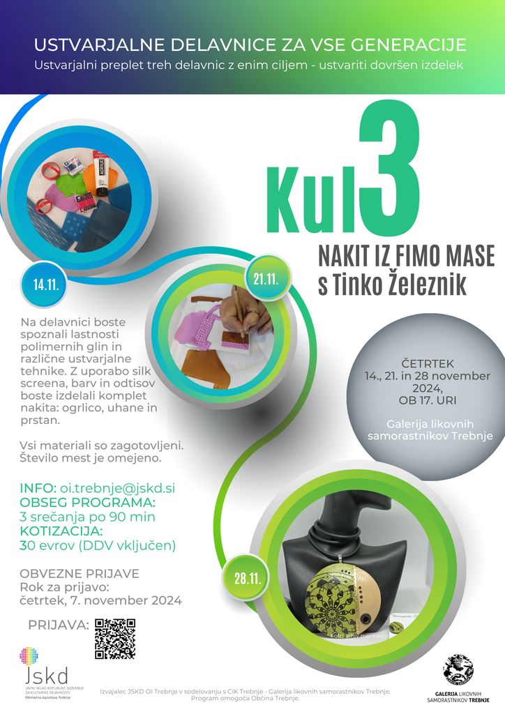 Doslej so na tovrstnih delavnicah že ustvarjali z glino, spoznavali kaligrafijo in raziskovali mozaik. Novembra pa se bodo z mentorico Tinko Železnik preizkusili še v izdelavi nakita. Na treh delavnicah bodo spoznali lastnosti polimernih glin in različne ustvarjalne tehnike. Z uporabo »silk screena«, barv in odtisov bodo udeleženci izdelali komplet nakita: ogrlico, uhane in prstan. Vsi materiali bodo zagotovljeni, več informacij pa na oi.trebnje@jskd.si.