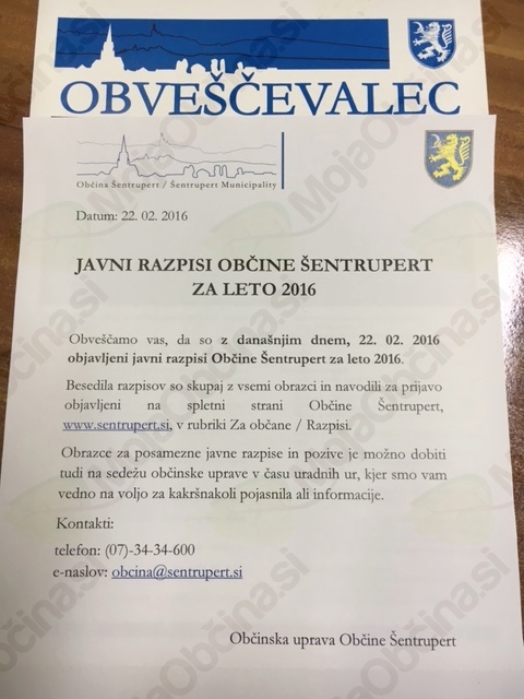Obveščamo, da so z današnjim dnem, 22. 02. 2016 objavljeni javni razpisi Občine Šentrupert za leto 2016.