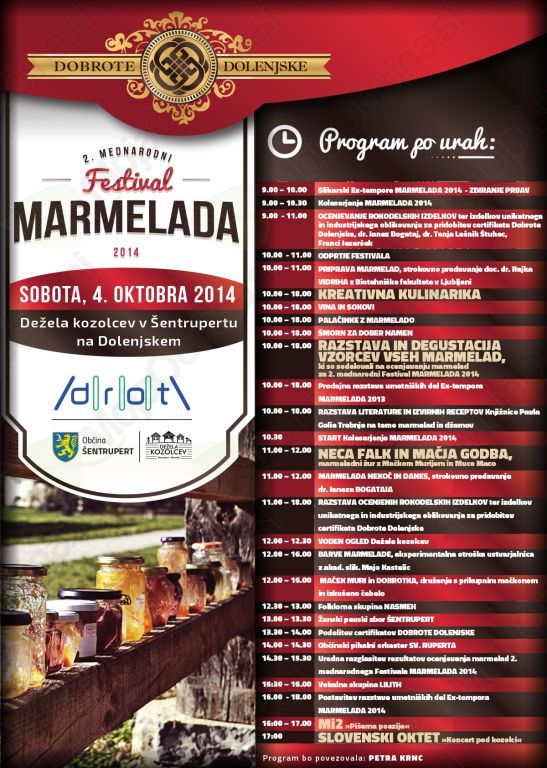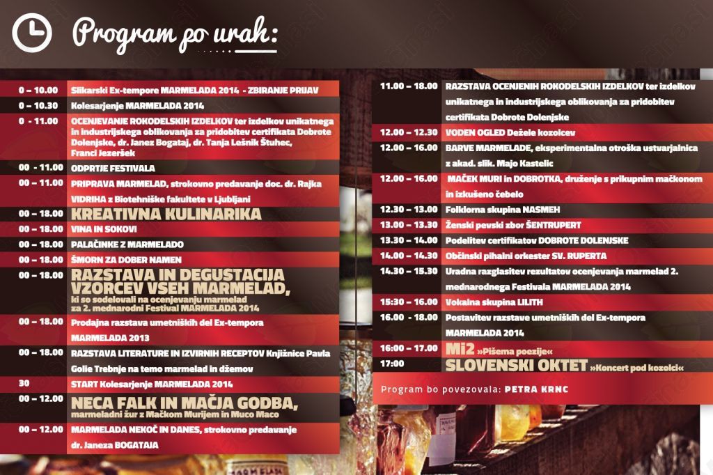 Festivalska sobota bo pestra, z marmelado pa bo povezala kreativno kulinariko, glasbo, petje, ples, strokovna predavanja, degustacije, dobrodelnost, razstave, otroško ustvarjanje, rekreacijo in likovno umetnost. Dogodek, organiziran v sklopu Dobrot Dolenjske, bodo obogatili: Maček Muri in Muca Maca v izvedbi Nece Falk in Mačje godbe, Mi2, Slovenski oktet, Folklorna skupina Nasmeh, Ženski pevski zbor Šentrupert, Občinski pihalni orkester sv. Rupert, Vokalna skupina Lilith in mnogi drugi.