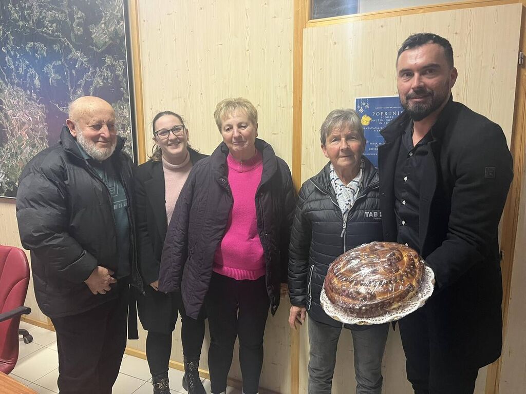 Kot vsako leto do sedaj so ga na Občino Šentrupert prinesli predstavniki nosilcev izdelave poprtnika za blagoslov v letu 2026. Župan Tomaž Ramovš je iz rok Vikija Uhana, Heme Bizjak in Vide Končina sprejel božični kruh.