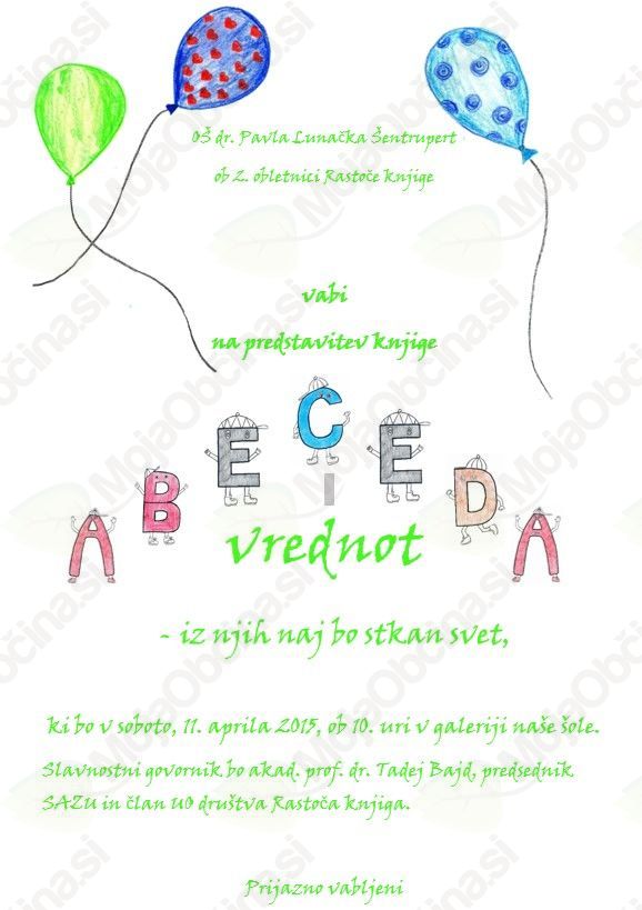 OŠ dr. Pavla Lunačka Šentrupert ob 2. obletnici Rastoče knjige vabi na predstavitev knjige Abeceda vrednot - iz njih naj bo stkan svet, ki bo v soboto, 11. aprila 2015, ob 10. uri v galeriji naše šole.
