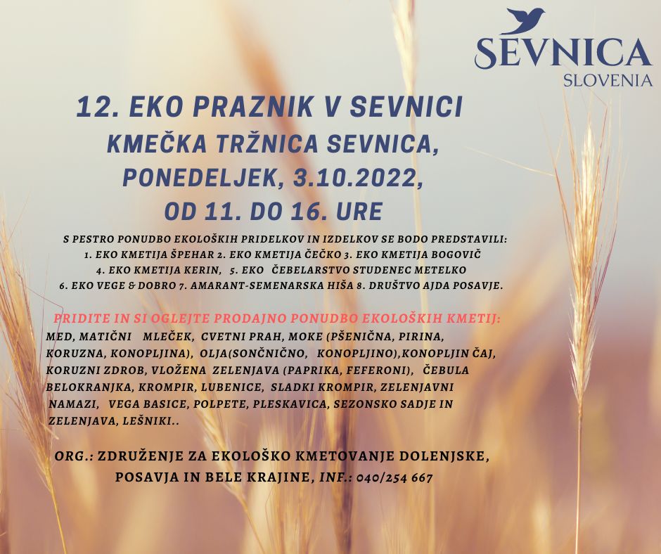VABIMO VAS na 12. EKOPRAZNIK v Sevnici, v ponedeljek, 3. oktobra 2022 od 11. do 16. ure na KMEČKI TRŽNICI S pestro ponudbo ekoloških pridelkov in izdelkov se bodo predstavili: 1. EKO kmetija Špehar 2. EKO kmetija Čečko 3. EKO kmetija Bogovič 4. EKO kmetija Kerin 5. EKO čebelarstvo Studenec Metelko 6. EKO Vege & Dobro 7. AMARANT-semenarska hiša 8. Društvo Ajda Posavje Pridite in si oglejte prodajno ponudbo ekoloških kmetij Med, matični mleček, cvetni prah, moke (pšenična, pirina, koruzna, konopljina), olja(sončnično, konopljino),konopljin čaj, koruzni zdrob, vložena zelenjava (paprika, feferoni), čebula belokranjka, krompir, lubenice, sladki krompir, zelenjavni namazi, vega basice, polpete, pleskavica, sezonsko sadje in zelenjava, lešniki.. Informacije na: 040/254 667 V ponedeljek, 3. oktobra 2022, v Sevnici, se razvajajte ekološko.