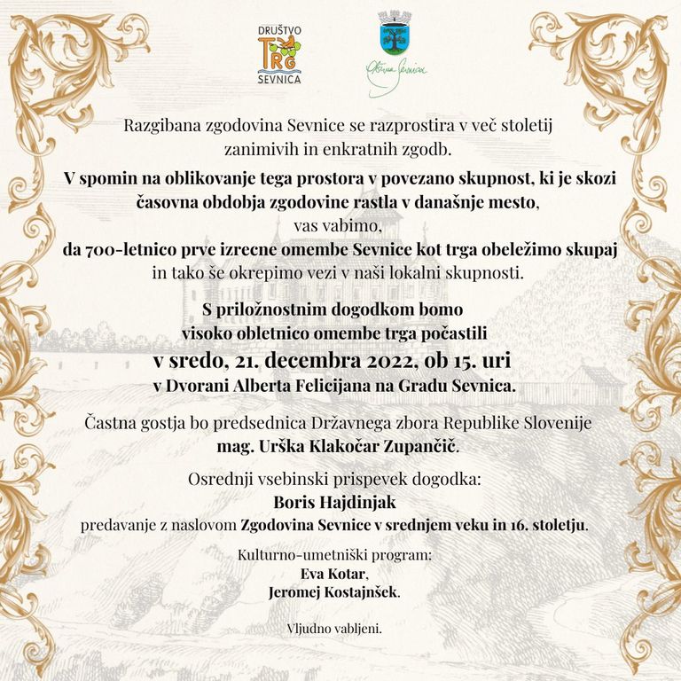700-letnico prve izrecne omembe Sevnice kot trga obeležujemo na pobudo Društva Trg Sevnica.