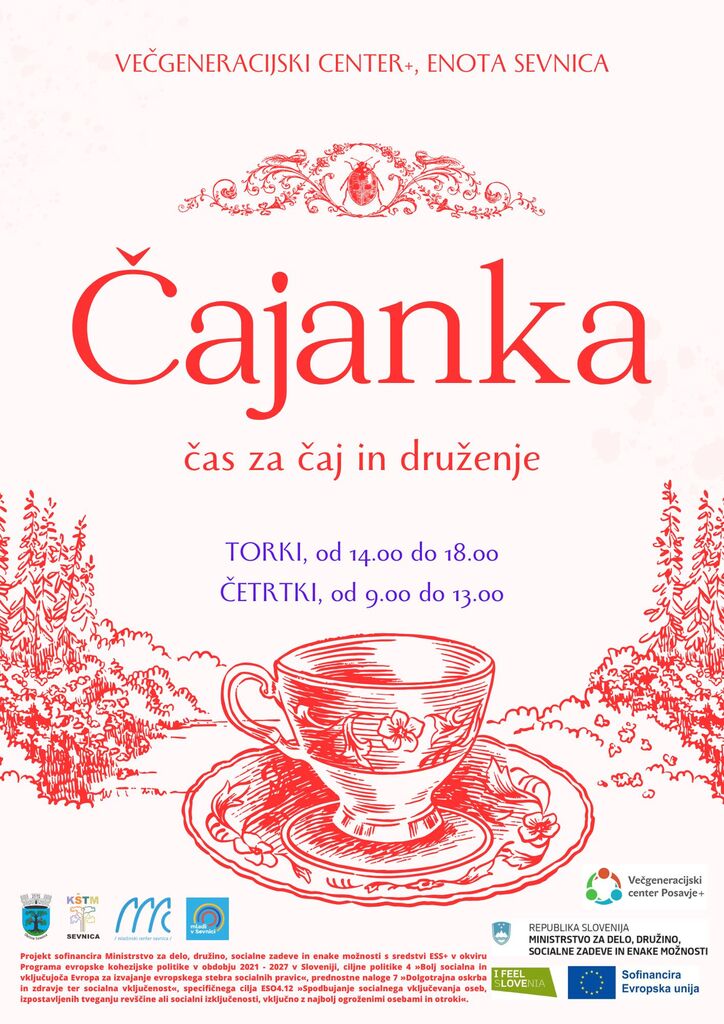 Vabljeni na čajanko, kjer bo prijetno druženje ob skodelici izbranega čaja. Skupaj bomo uživali v različnih vrstah čajev, se sprostili in poklepetali v prijetnem vzdušju. Čajanka je namenjena vsem, ki si želijo mirnega trenutka zase in družbe prijaznih ljudi.