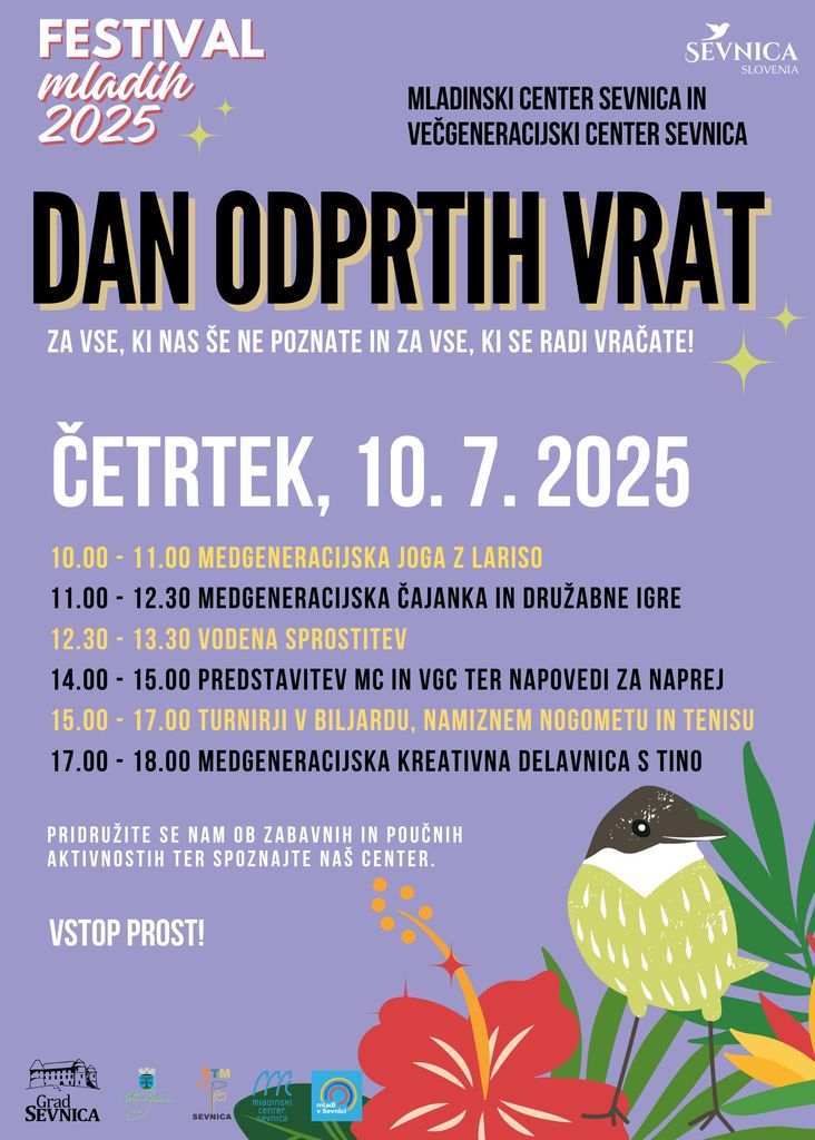 10. 07. ob 10.00 je Dan odprtih vrat Mladinskega centra Sevnica in Večgeneracijskega centra Posavje+, enota Sevnica na Trgu svobode 10, s pestrim dogajanjem: