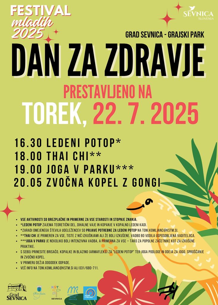 08. 07. ob 16.00 bo v sklopu Festivala mladih na Gradu Sevnica Dan za zdravje, na katerem bodo naslednje aktivnosti: