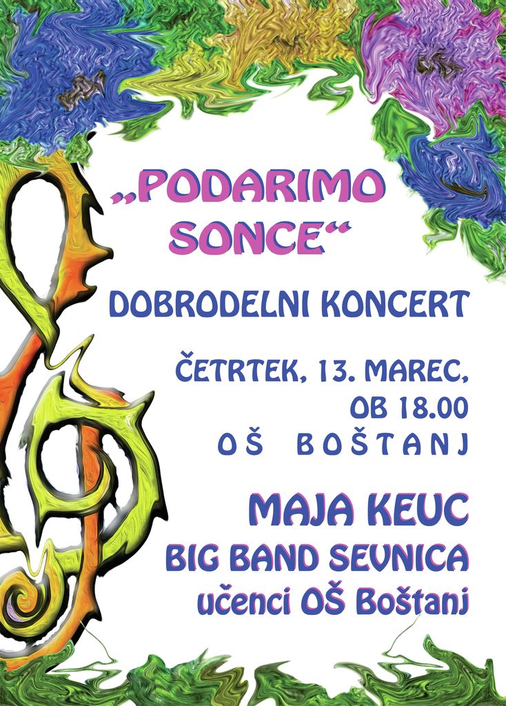 V letošnjem šolskem letu na Osnovni šoli Boštanj prirejamo dobrodelni koncert z naslovom »Podarimo sonce«. Tokrat bosta otroški in mladinski pevski zbor sodelovala z Big bandom Sevnica in Majo Keuc, s plesnimi vložki pa bodo nastopili prav vsi učenci in učenke osnove šole. Koncert se bo odvil 13. marca ob 18. uri v telovadnici Osnovne šole Boštanj. Zbrana sredstva bomo namenili šolskemu skladu. Lepo vabljeni.
